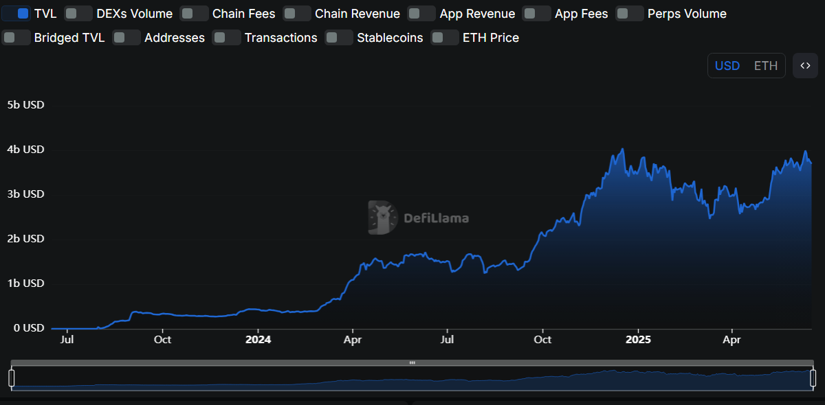 Общий объем заблокированных средств в Base вырос более чем вдвое за последний год. Источник: DefiLlama.