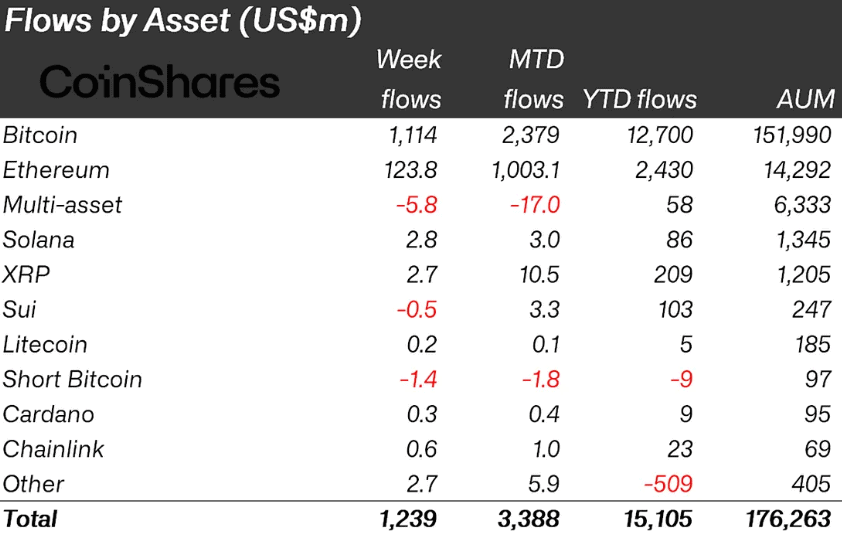 В разрезе активов лидируют биткоин и Ethereum — $1,1 млрд и $124 млн соответственно. Отрицательной динамикой отметились фонды на базе Sui и те, которые удерживают короткие позиции по первой криптовалюте.