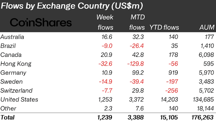 По рынках прослеживается смешанная картина. Швейцария, Швеция, Гонконг и Бразилия «в минусе». Среди остальных лидируют США, что неудивительно с учетом спотовых криптовалютных ETF.