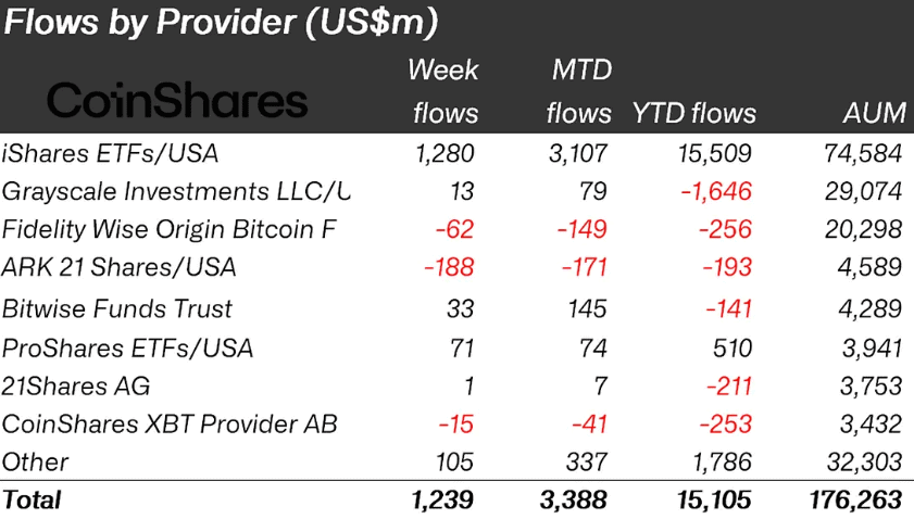 Среди поставщиков «в минусе» только Ark Invest, Fidelity Investments/Wise Origin и CoinShares. В лидерах по-прежнему iShares, дочерняя фирма BlackRock.