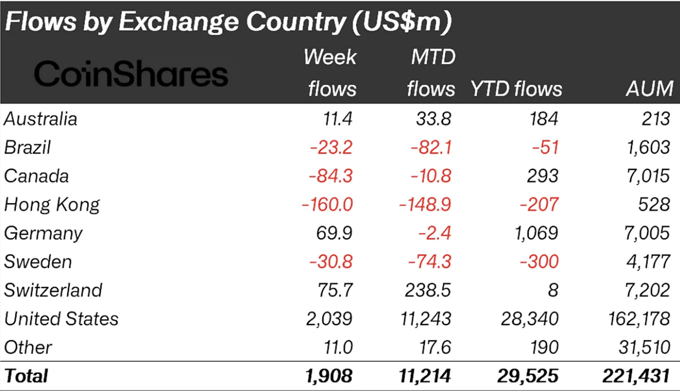 В региональном разрезе лидером стали США — $2 млрд. На втором месте оказалась Германия с притоком в размере $70 млн. В Бразилии, Канаде и Гонконге наблюдались оттоки: $23,2 млн, $84,3 млн и $160 млн соответственно.