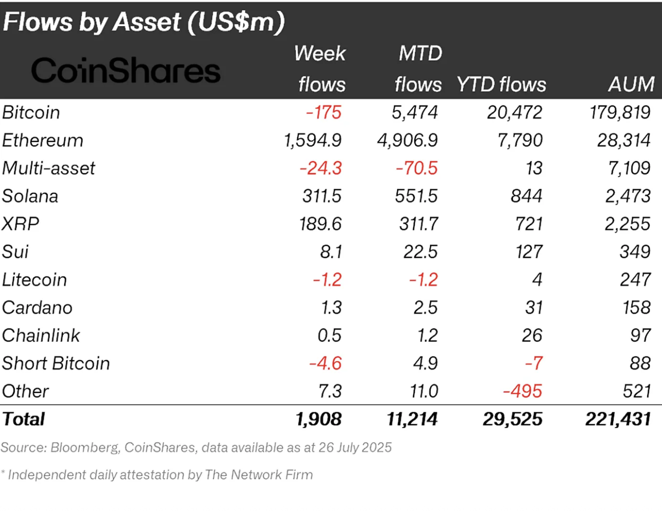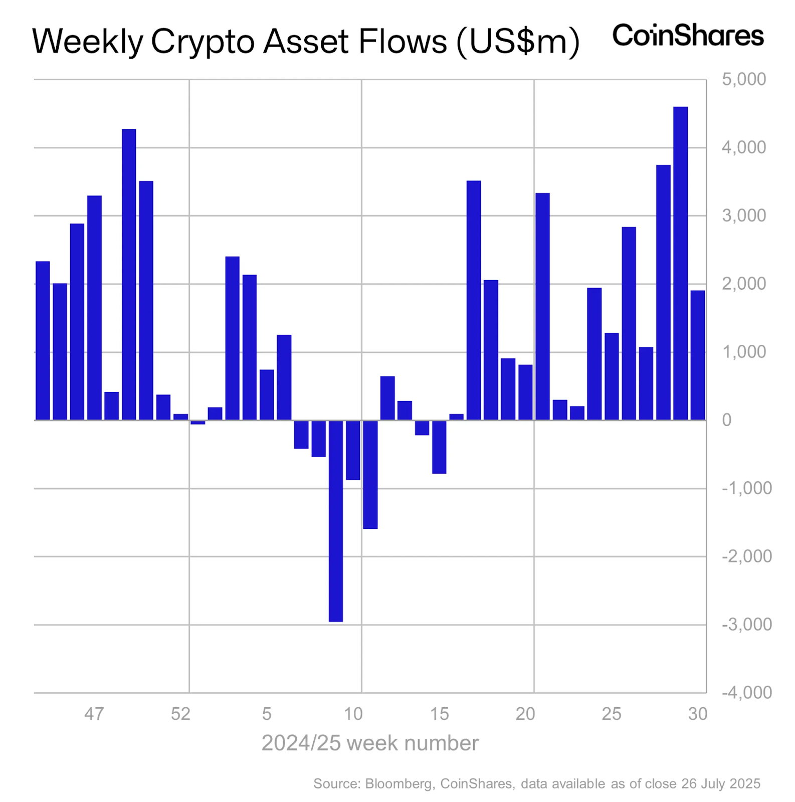 С 19 по 25 июля криптовалютные фонды привлекли $1,9 млрд. Приток с начала месяца достиг рекордных $11,2 млрд, превысив предыдущий максимум на уровне $7,6 млрд, согласно отчету CoinShares.