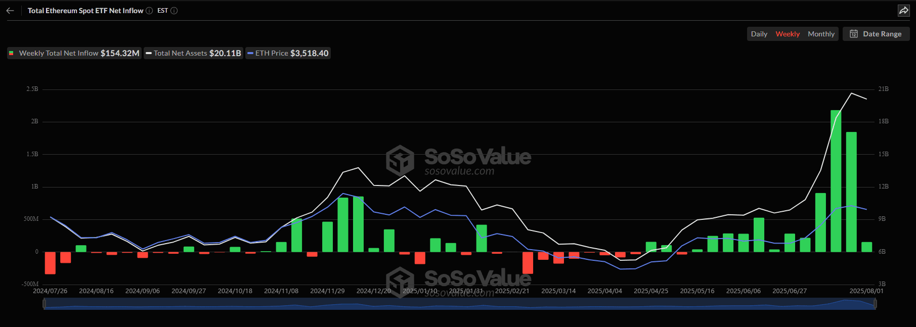 В то же время фонды, ориентированные на Ethereum, сохранили положительную динамику. Приток в этот класс активов за упомянутый отчетный период составил $154,3 млн. Объем инвестиции на протяжении почти всей недели оставался стабильно высоким, однако 1 августа Ethereum-ETF показали чистый отток $152,3 млн.