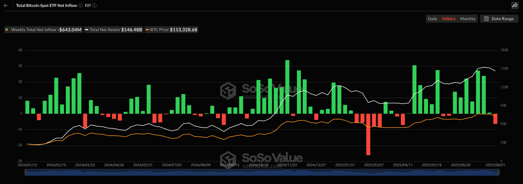 В период с 28 июля по 1 августа 2025 года настроения институциональных инвесторов в отношении криптовалютных ETF оказались смешанными. Согласно данным SoSoValue, фонды на базе биткоина завершили неделю с чистым оттоком в $643 млн.