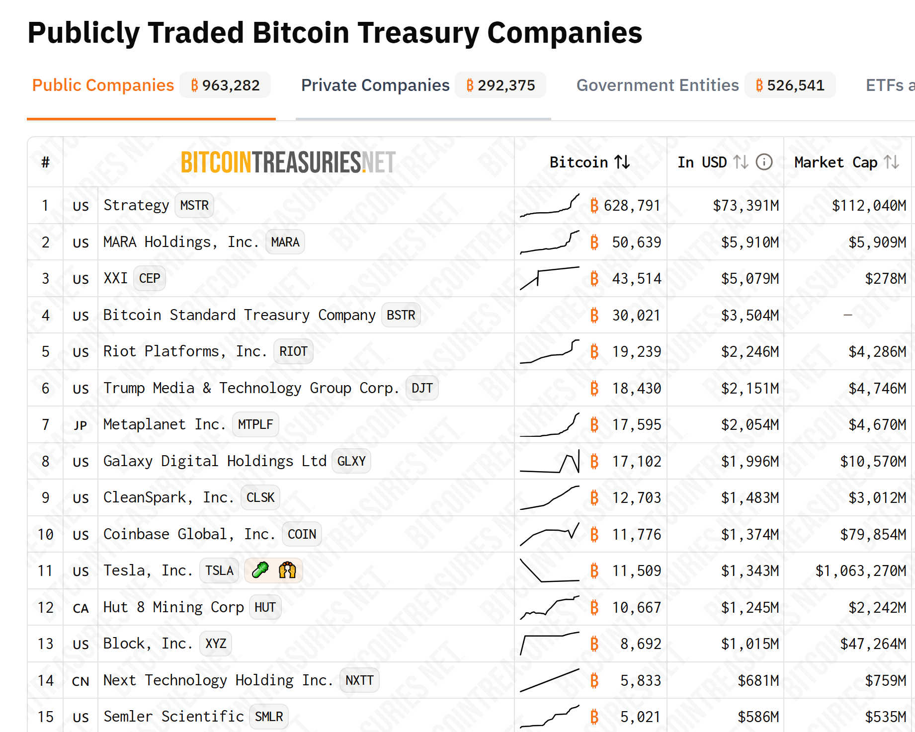 15 крупнейших казначейских компаний Bitcoin. Источник: BitcoinTreasuries.Net