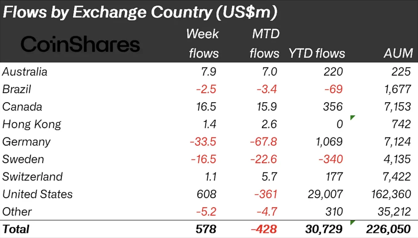 В региональном разрезе лидировали США — $608 млн. На втором месте оказалась Канада с $16,5 млн. В Европе преобладали медвежьи настроения: Германия, Швеция и Швейцария зафиксировали совокупный отток в $54,3 млн.