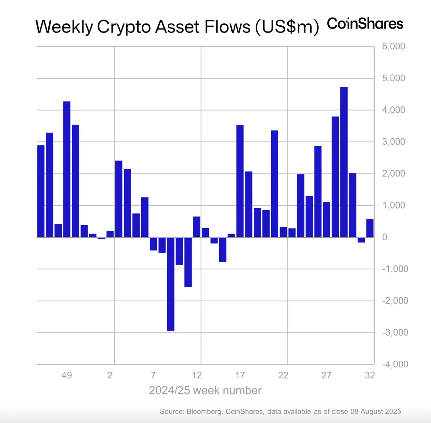 Со 2 по 8 августа криптофонды привлекли $572 млн. Приток с начала года превысил $30 млрд, говорится в новом отчете CoinShares.