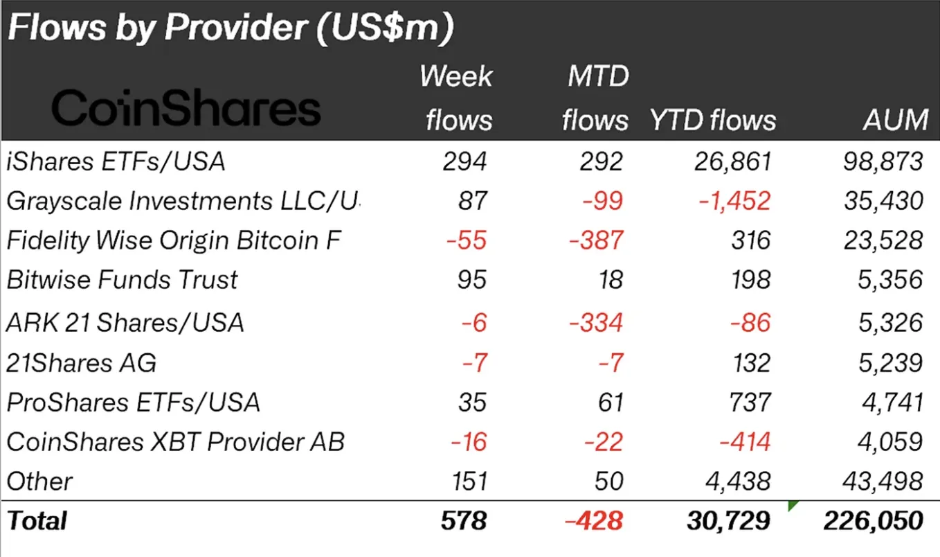 Среди эмитентов в недельном притоке лидировал биткоин-ETF от BlackRock с $294 млн. Фонды от Grayscale, Bitwise и ProShares привлекли $87 млн, $95 млн и $35 млн соответственно.