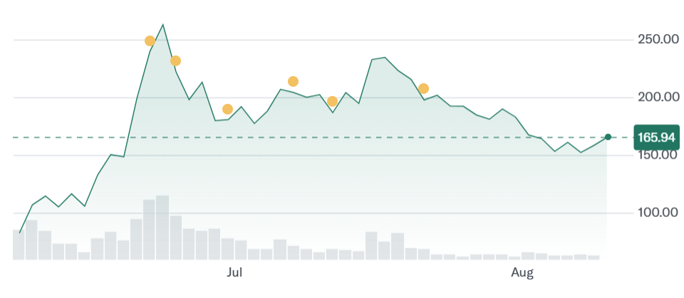 Акции Circle сейчас торгуются примерно по $165, на 140% выше стартовой цены. Источник: Yahoo Finance