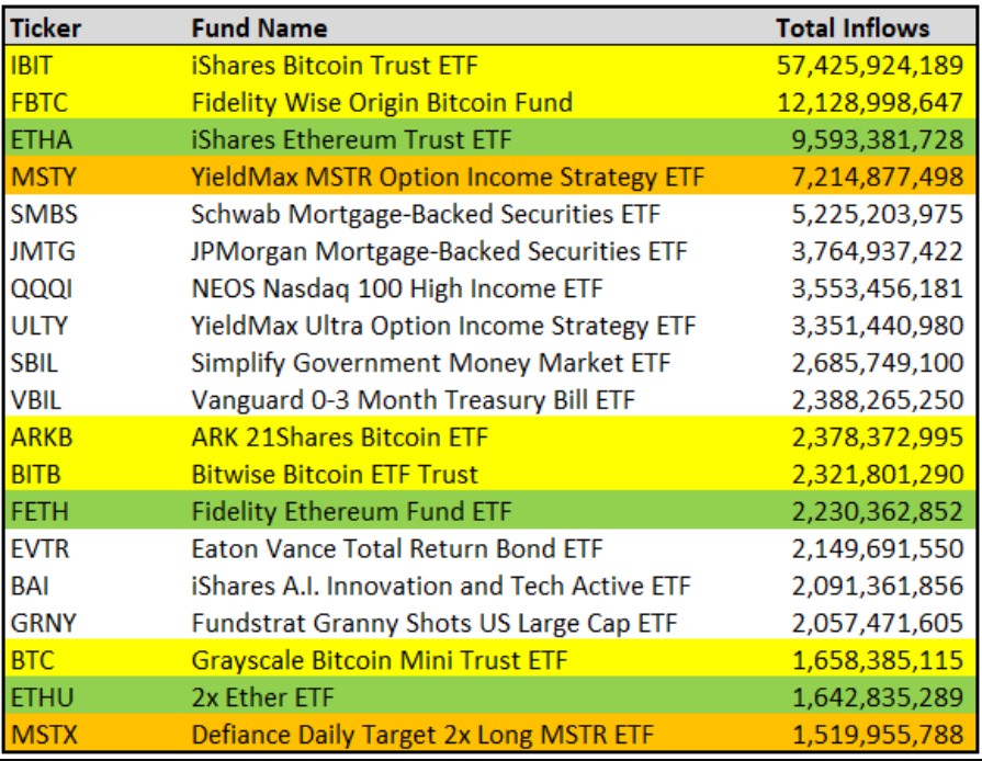 В понедельник аналитик ETF Нейт Джерачи опубликовал данные, согласно которым с января 2024 года на рынок вышло более 1300 новых биржевых фондов. При этом криптовалютные продукты заняли лидирующие позиции в топ-20 по объему привлеченных средств.