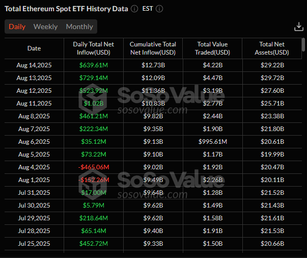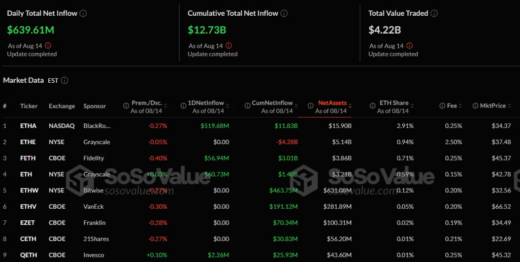 14 августа чистый приток в спотовые Ethereum-ETF в США составил $639,6 млн.