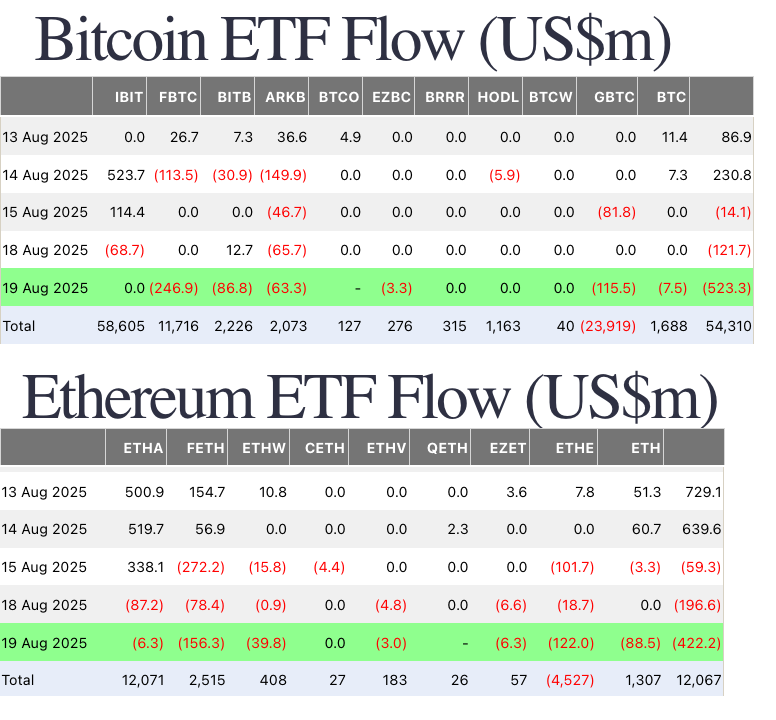 Ежедневные потоки средств из ETF на биткоин и эфир с 13 августа. Источник: Farside.co.uk
