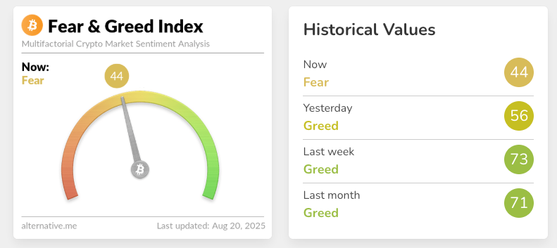 В среду индекс страха и жадности — инструмент, отслеживающий общие настроения на крипторынке — перешел на уровень «страх», достигнув значения 44. Это изменение произошло после продолжительного периода оптимизма, что свидетельствует о растущей осторожности среди инвесторов.