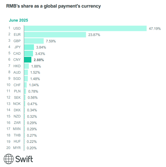 По данным RMB Tracker от SWIFT, по состоянию на июнь китайский юань был шестой наиболее активной валютой в мировых платежах с долей около 2,9%. Показатель доллара США превышает 47%.