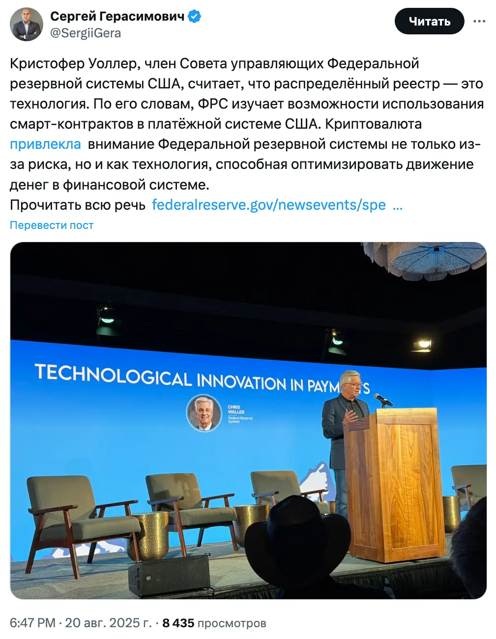 Комментарии Уоллера отражают устойчивый поворот ФРС к использованию криптовалют и их будущей роли в платежной системе США. В апреле ФРС отменила рекомендации, действовавшие с 2022 года и сдерживавшие банки от участия в криптовалютной и стейблкоин-деятельности.