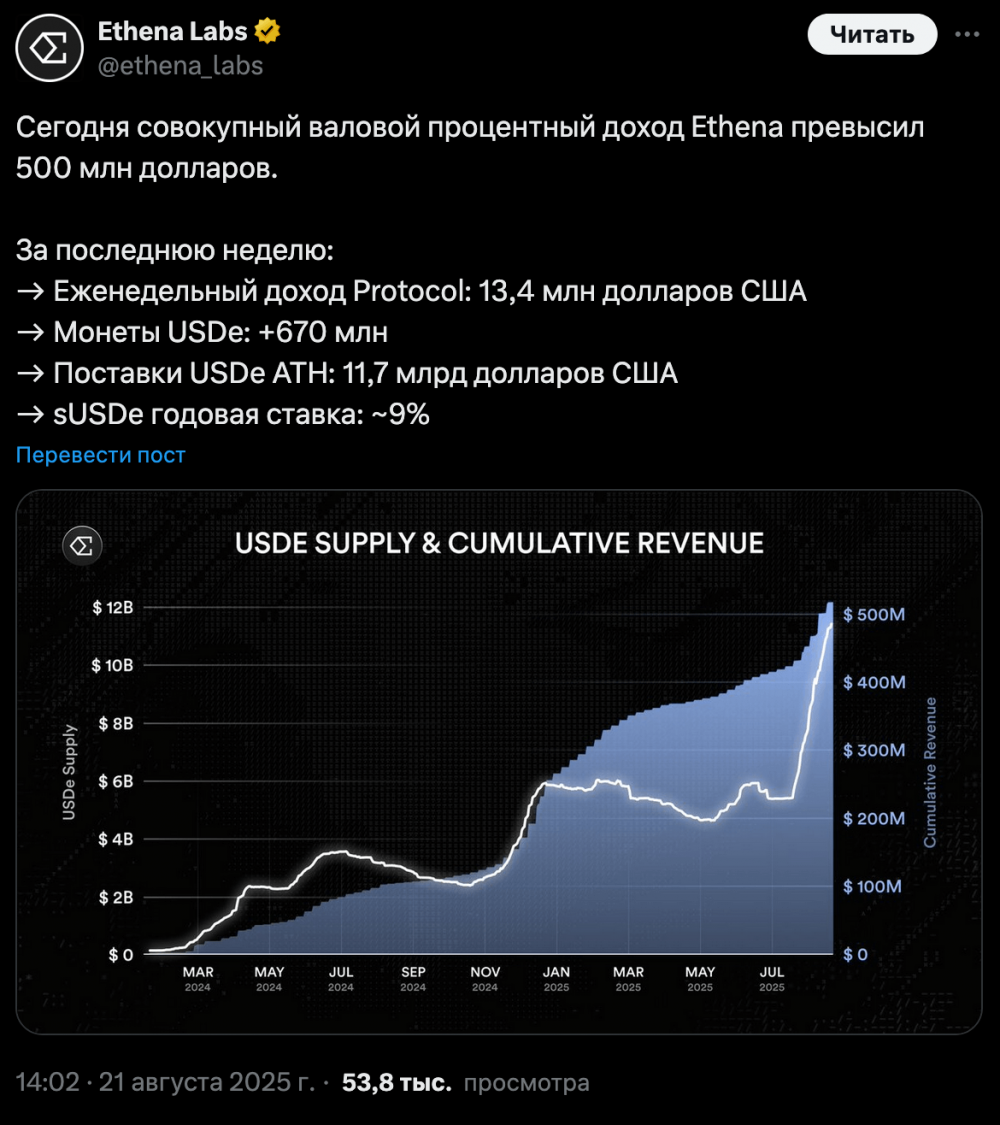 Ethena Labs опубликовала эту новость в социальной сети X, сообщив, что за прошедшую неделю доход протокола достиг $13,4 млн, а предложение USDe достигло исторического максимума в $11,7 млрд.