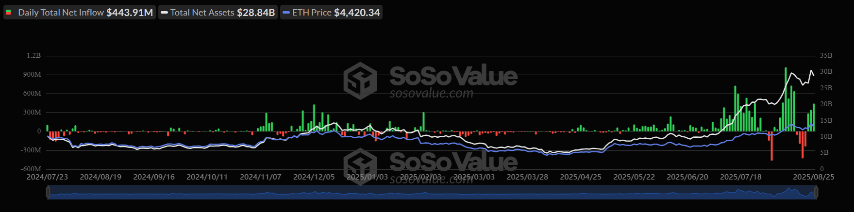 В секторе спотовых Ethereum-ETF приток составил $443,91 млн за сутки. Это преимущественно новый капитал в фонде ETHA от BlackRock — $314,89 млн. Помимо него, положительной динамикой также отметились: