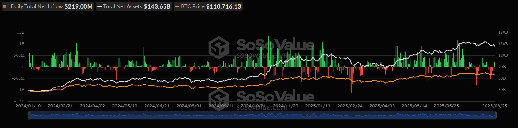 В сегменте спотовых биткоин-ETF чистый приток капитала составил $219 млн. Положительной динамикой отметились шесть продуктов, а именно: