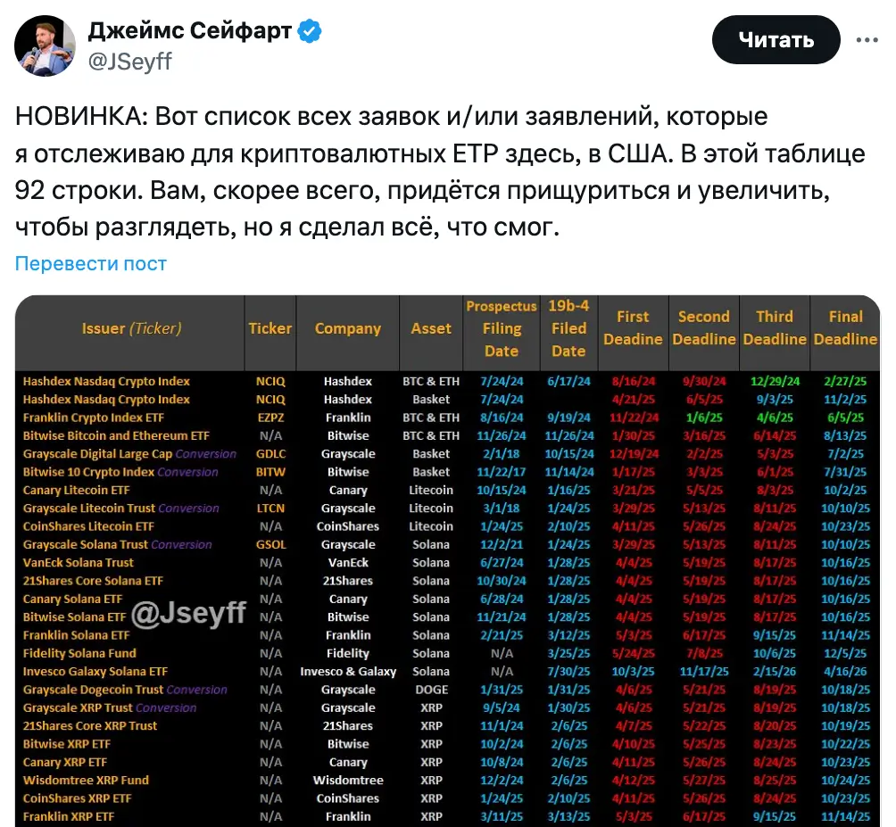 Согласно новым данным Джеймса Сейфарта, аналитика Bloomberg Intelligence по ETF, на рассмотрении находятся заявки на регистрацию фондов Solana (SOL) и Ripple (XRP).