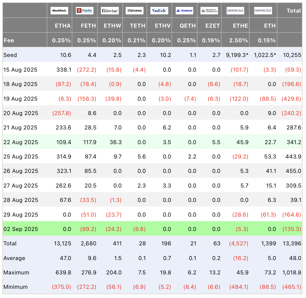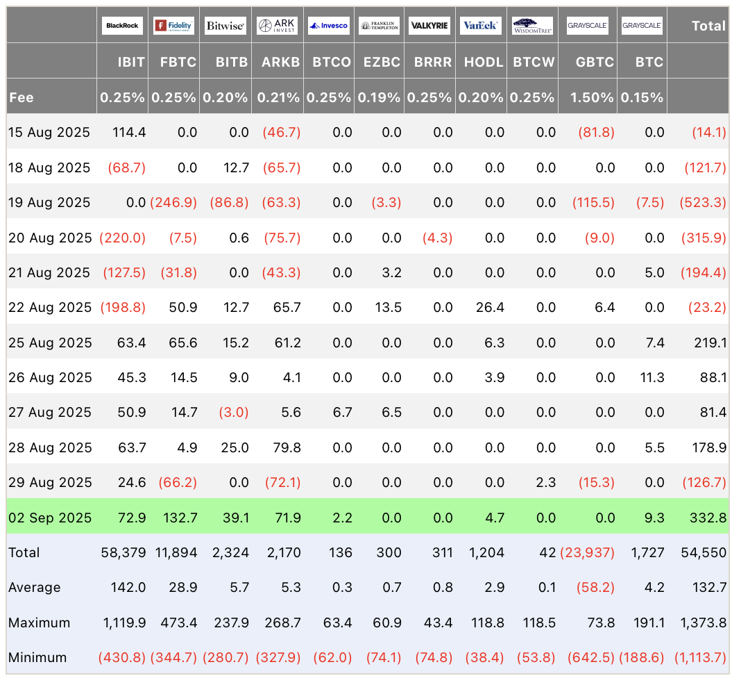 Вчера, 2 сентября, биткоин-ETF получили приток в $332,7 млн, в то время как Ethereum-фонды потеряли $135,3 млн — инвесторы явно решили, что цифровое золото надежнее альткоина.