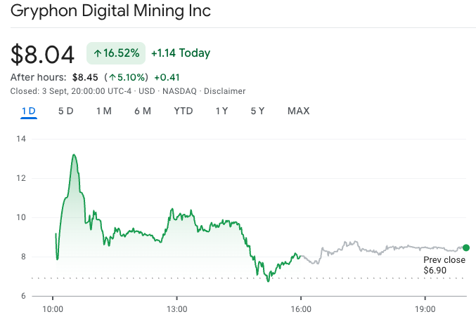 American Bitcoin, ранее Gryphon Digital Mining, в свой первый торговый день демонстрировала значительные колебания цены. Источник: Google Finance