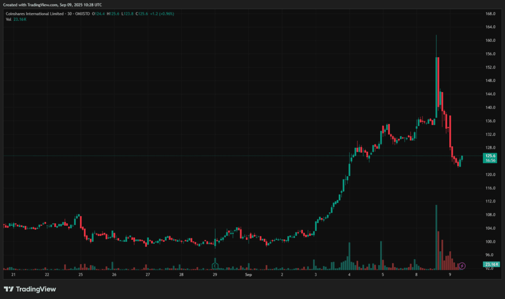 На данный момент акции CoinShares обращаются на Nasdaq Stockholm. После заявления о слиянии они резко прибавили в цене почти на 19% и достигли исторического максимума на отметке $161,6. Однако уже к утру 9 сентября стоимость ценных бумаг компании обвалилась на 22,5%, опустившись до $125,6, по данным TradingView.