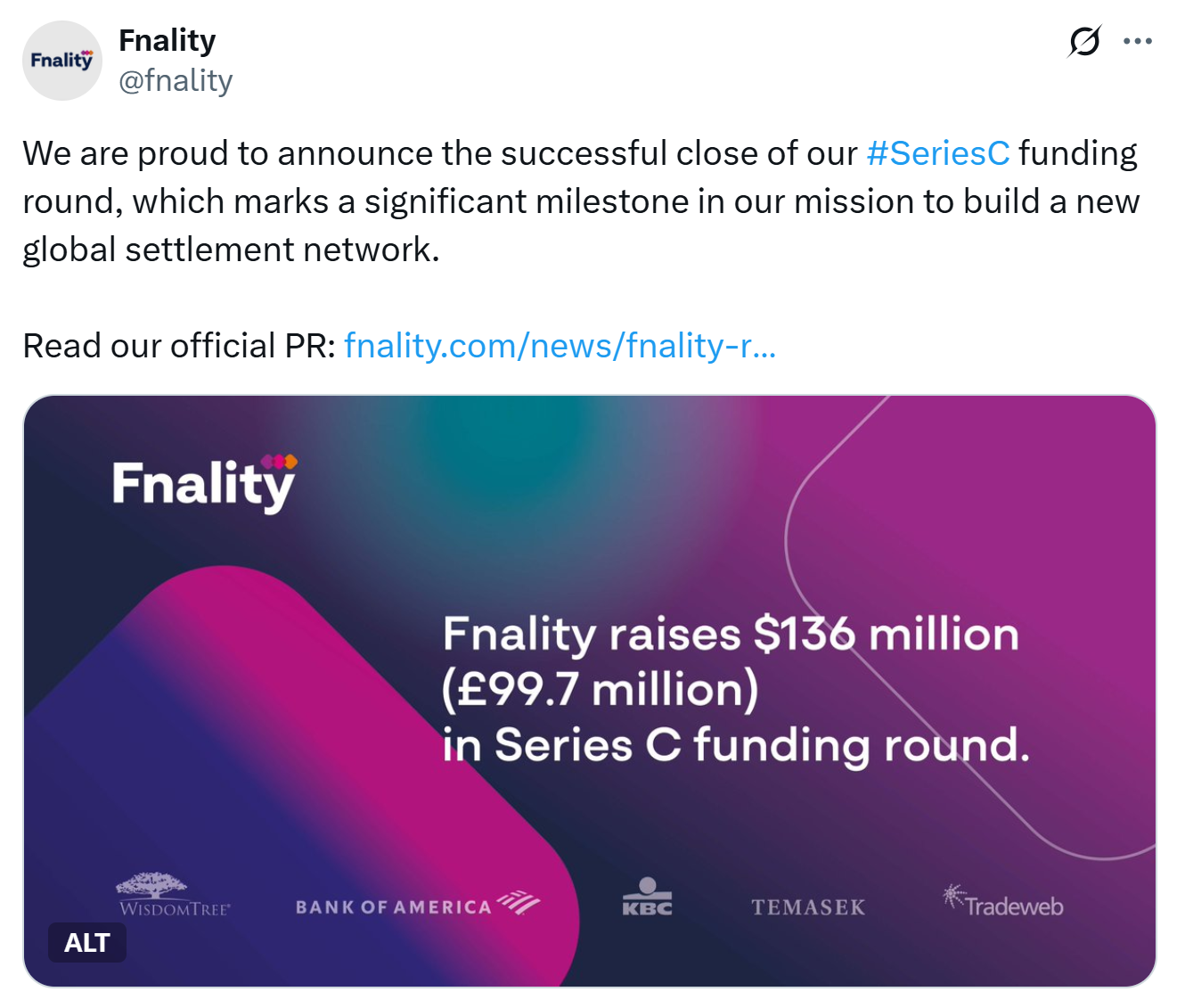 В 2023 году Fnality привлекла 95 миллионов долларов США в рамках раунда финансирования, организованного Goldman Sachs и BNP Paribas при участии Euroclear, DTCC, WisdomTree и существующего инвестора Nomura.