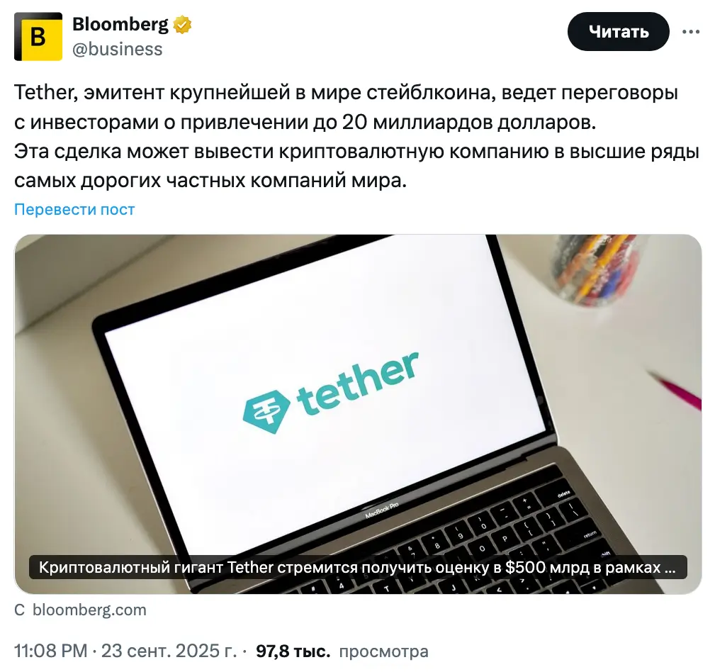 Bloomberg, ссылаясь на источники, знакомые с ситуацией, сообщил, что Tether рассматривает возможность привлечения от $15 млрд до $20 млрд в обмен на около 3% акций в рамках частного размещения. Ведущим консультантом выступает Cantor Fitzgerald.