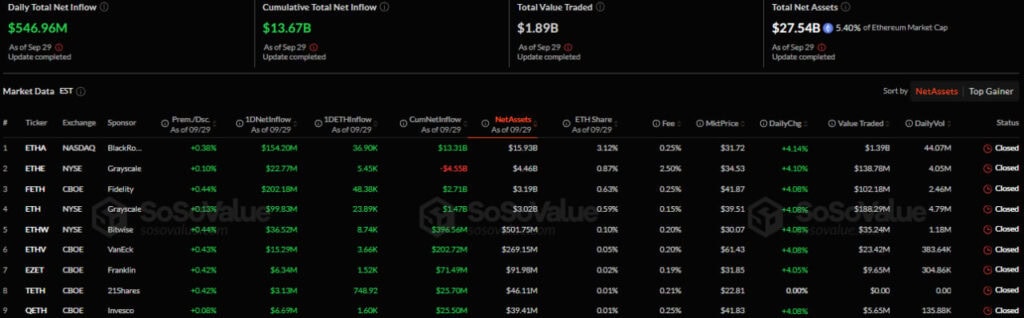 - 29 сентября приток в спотовые Ethereum-ETF составил $546,96 млн.