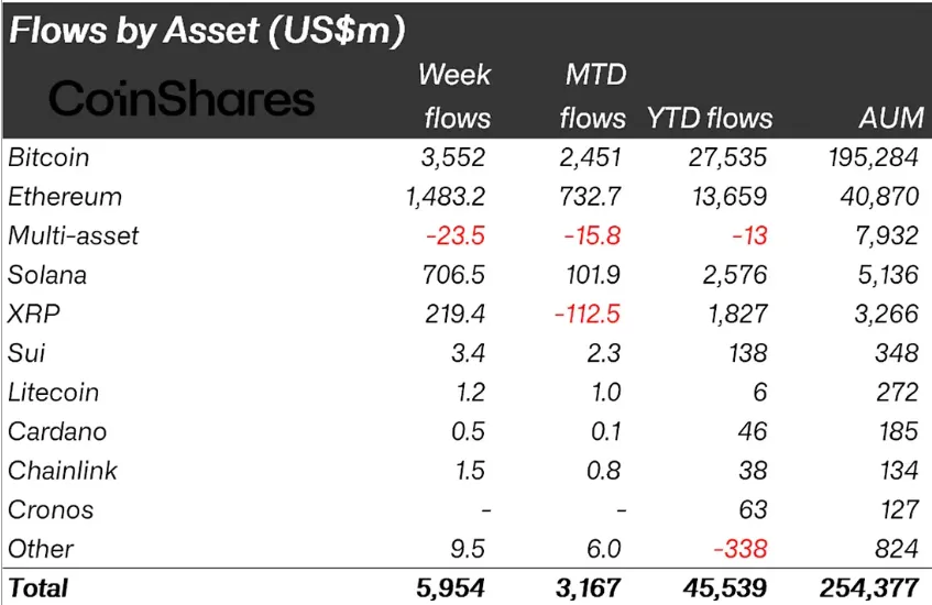 С 26 сентября по 4 октября инвесторы вложили в криптовалютные инвестиционные продукты рекордные $5,95 млрд. Об этом говорится в отчете CoinShares.