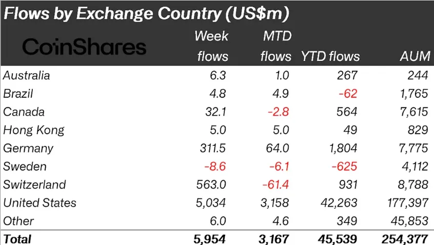 Основной объем средств пришелся на США, где зафиксировали приток в $5 млрд. Швейцария также установила новый максимум с результатом в $563 млн. В Германии зафиксирован второй по величине недельный приток в $312 млн.