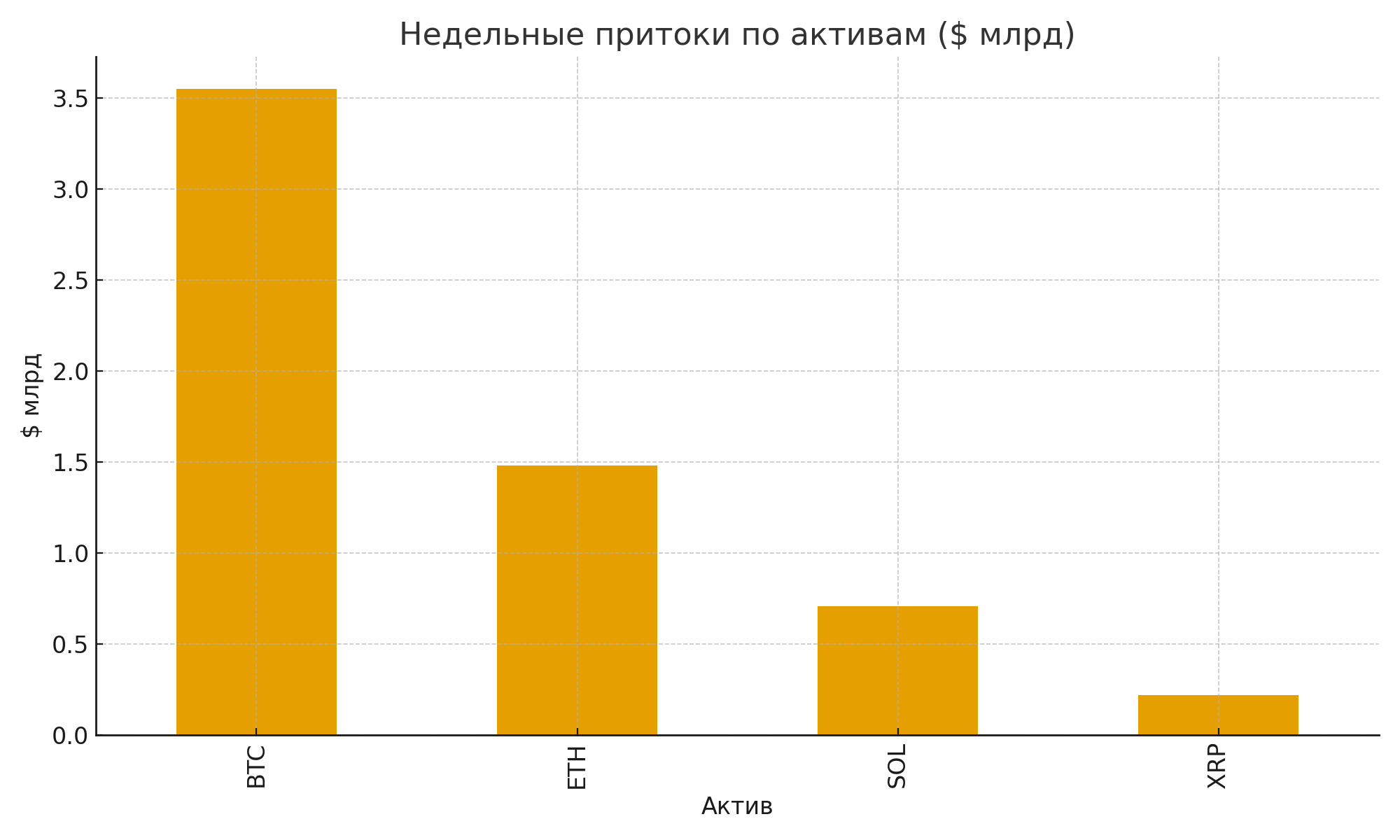 Bitcoin — главный бенефициар, получил $3,55 млрд притока, что стало рекордом для недели. Всего под управлением в фондах Bitcoin достиг $195 млрд.