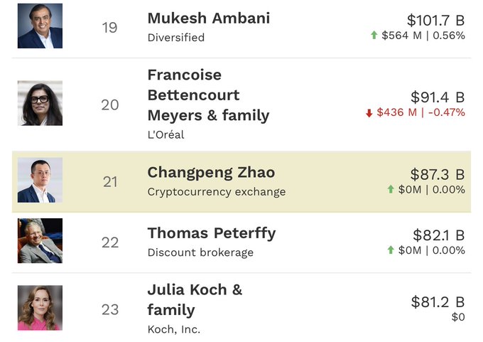 Согласно недавно опубликованным данным Forbes, Чанпэн Чжао (более известный как CZ), основатель криптовалютной биржи Binance, обладает состоянием в 87,3 млрд долларов. Это ставит его на 21-е место в мировом рейтинге самых богатых людей.