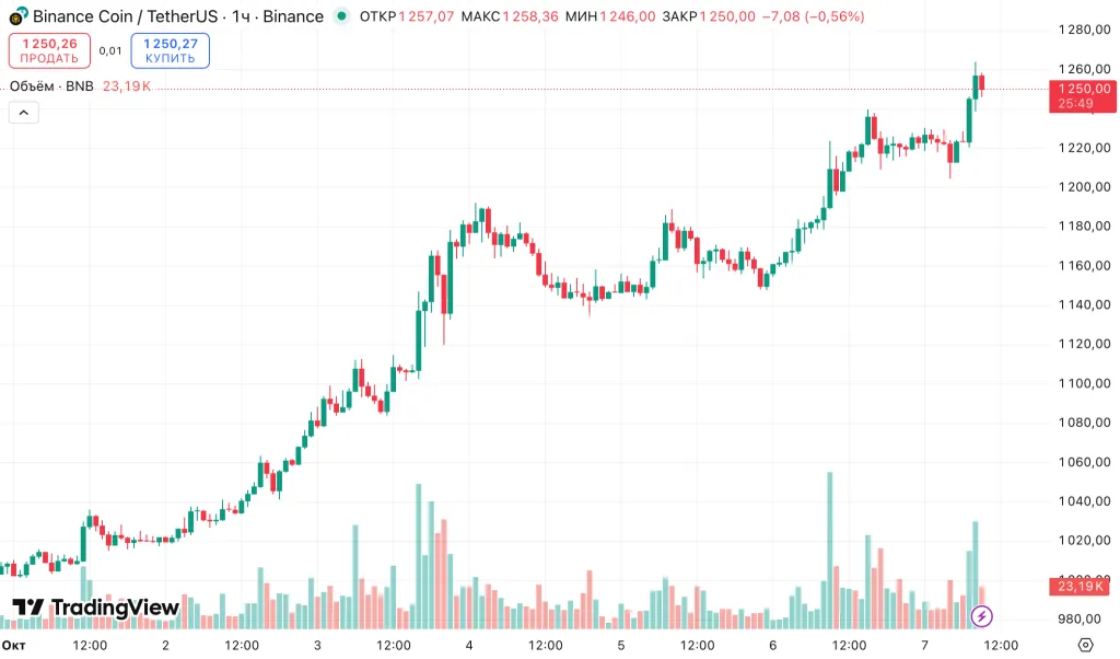 6 октября цена связанной с Binance криптовалюты впервые в истории превысила уровень $1200. На момент написания BNB торгуется по $1250, подорожав на 3% за последние сутки.