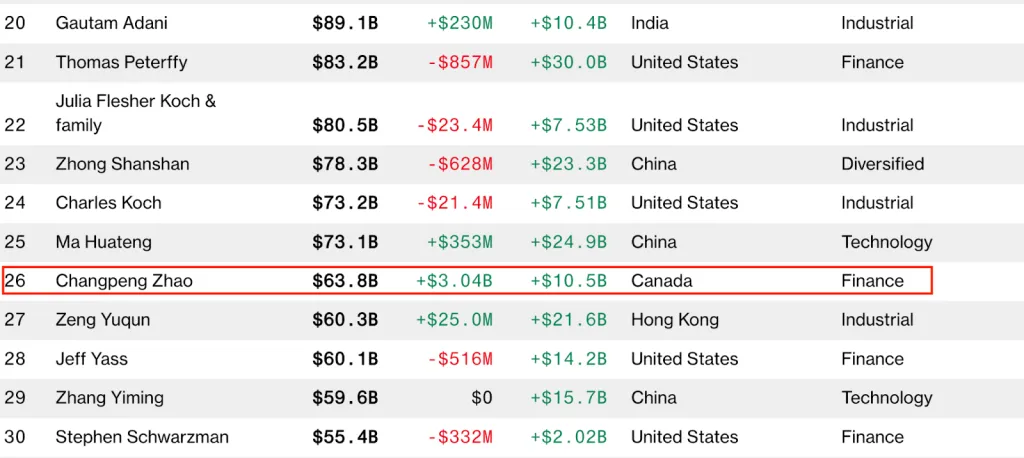 Bloomberg Billionaires Index поставил CZ на 26 место, оценив его состояние в $63,8 млрд. По данным экспертов, с начала года портфель Чжао увеличился на $10,5 млрд.