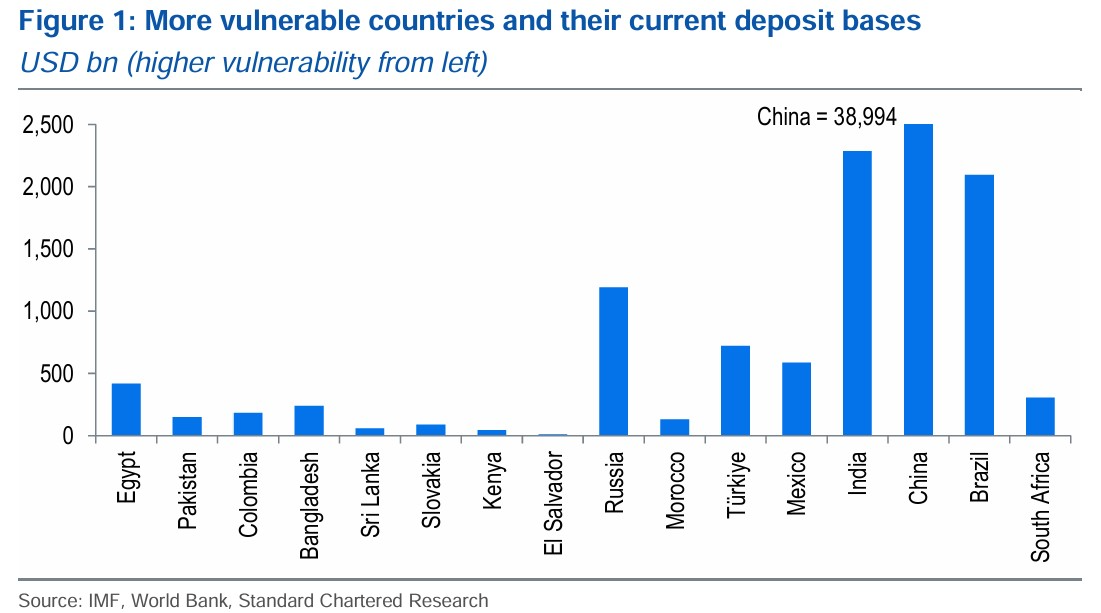 Более уязвимые страны и их текущая депозитная база. Источник: Standard Chartered.