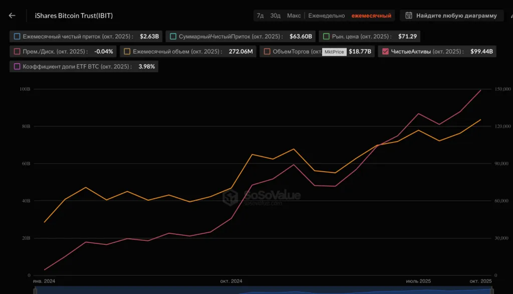 В качестве примера растущего интереса к виртуальным активам спикер указал на значительный приток средств в биткоин-ETF. Например, общая сумма средств под управлением iShares Bitcoin Trust от BlackRock приближается к $100 млрд.