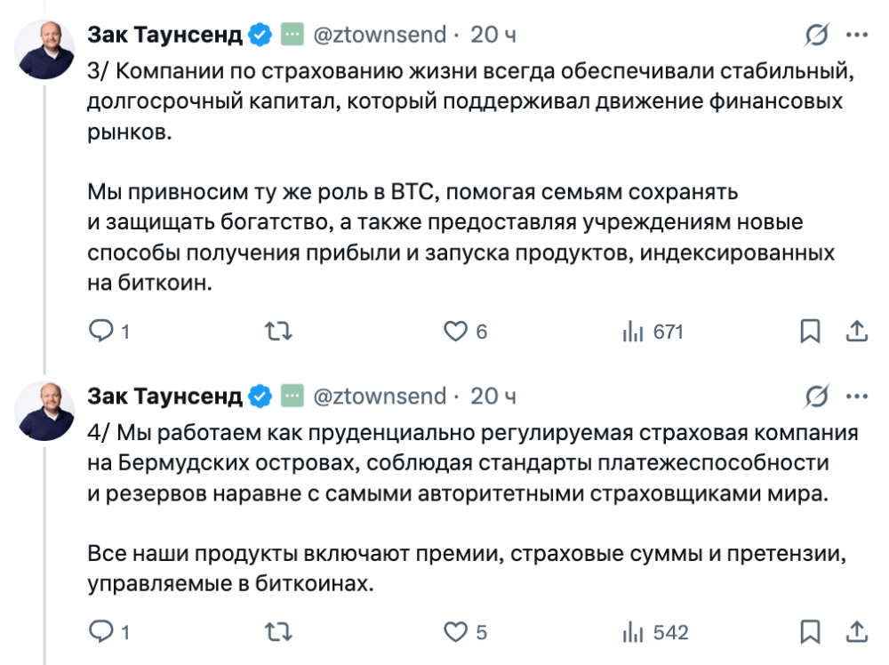 Он добавил, что по мере совершенствования регулирования ожидает, что «страховщики и перестраховщики будут рассматривать биткоин как дополнение к суверенным инструментам с фиксированным доходом».