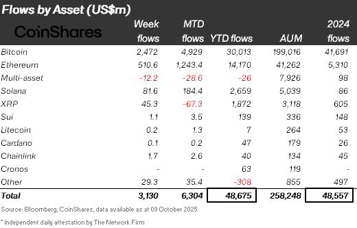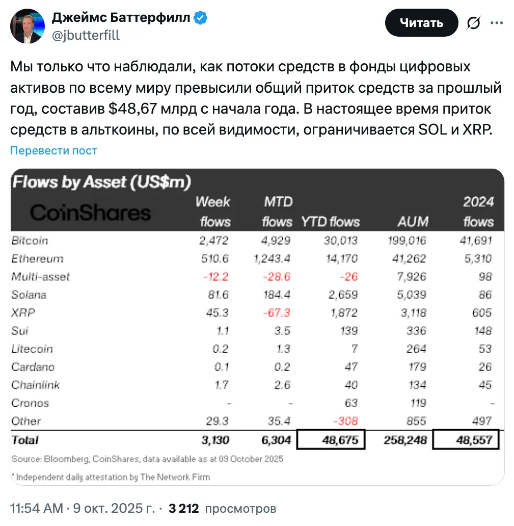 По словам руководителя исследований CoinShares Джеймса Баттерфилла, мировые криптовалютные биржевые продукты (ETP) привлекли $48,67 млрд с начала года, что превышает годовой показатель за 2024 год.
