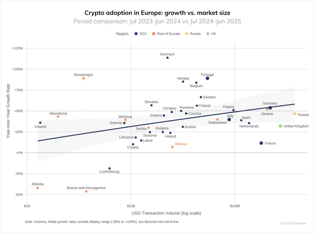 Среди основных драйверов — увеличение количества крупных институциональных переводов. Количество транзакций на сумму свыше $10 млн подскочило на 86%, что почти вдвое превышает среднее значение по Европе.