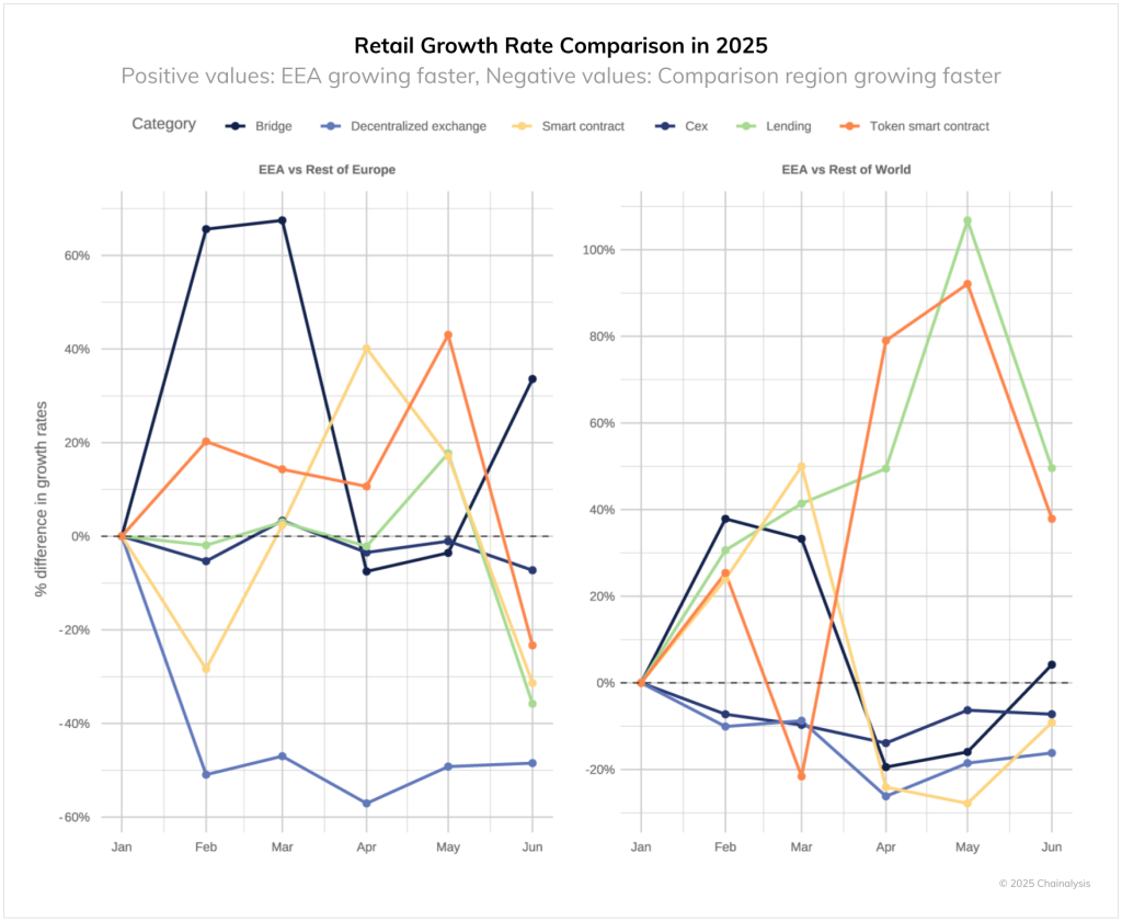 В DeFi-секторе тоже наблюдался устойчивый рост. Страны Европейской экономической зоны выделились по кроссчейн-операциям — в феврале и марте 2025 года активность в этой категории была на 65% выше, чем в других регионах. Среди европейских пользователей также вырос интерес к криптокредитованию.