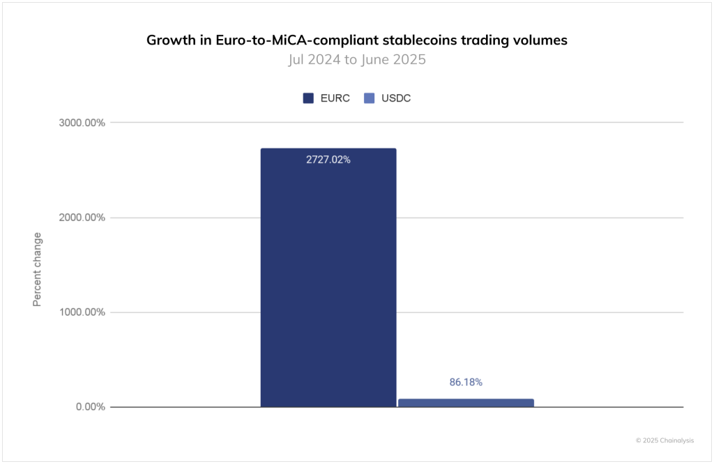 Ограничение доступа к несоответствующим MiCA активам вроде USDT вызвало перераспределение ликвидности. Использование EURC от Circle подскочило на 2727% с июля 2024 года по июнь 2025.