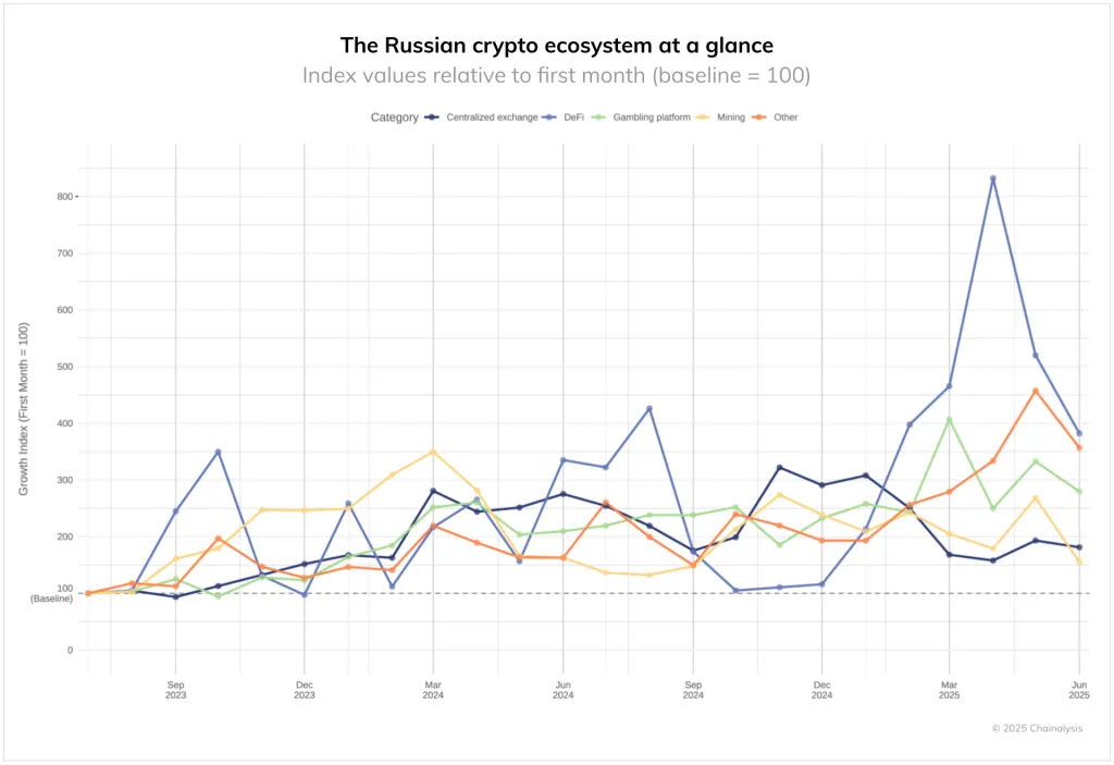 Эксперты также зафиксировали рекордный рост объема криптоопераций, приходящихся на Россию. Показатель достиг $379,3 млрд.