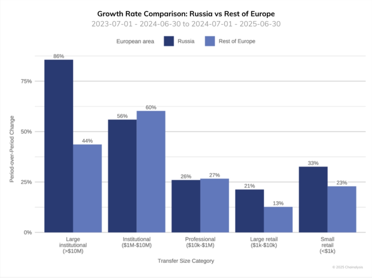 В других сегментах российской криптоэкосистемы, в частности в сфере розничной торговли, темпы роста умеренно превышали средние показатели по Европе, отметили авторы исследования. Например, переводы на сумму менее $1 тыс. увеличились в России на 33%, а в остальных европейских странах в среднем на 23%.