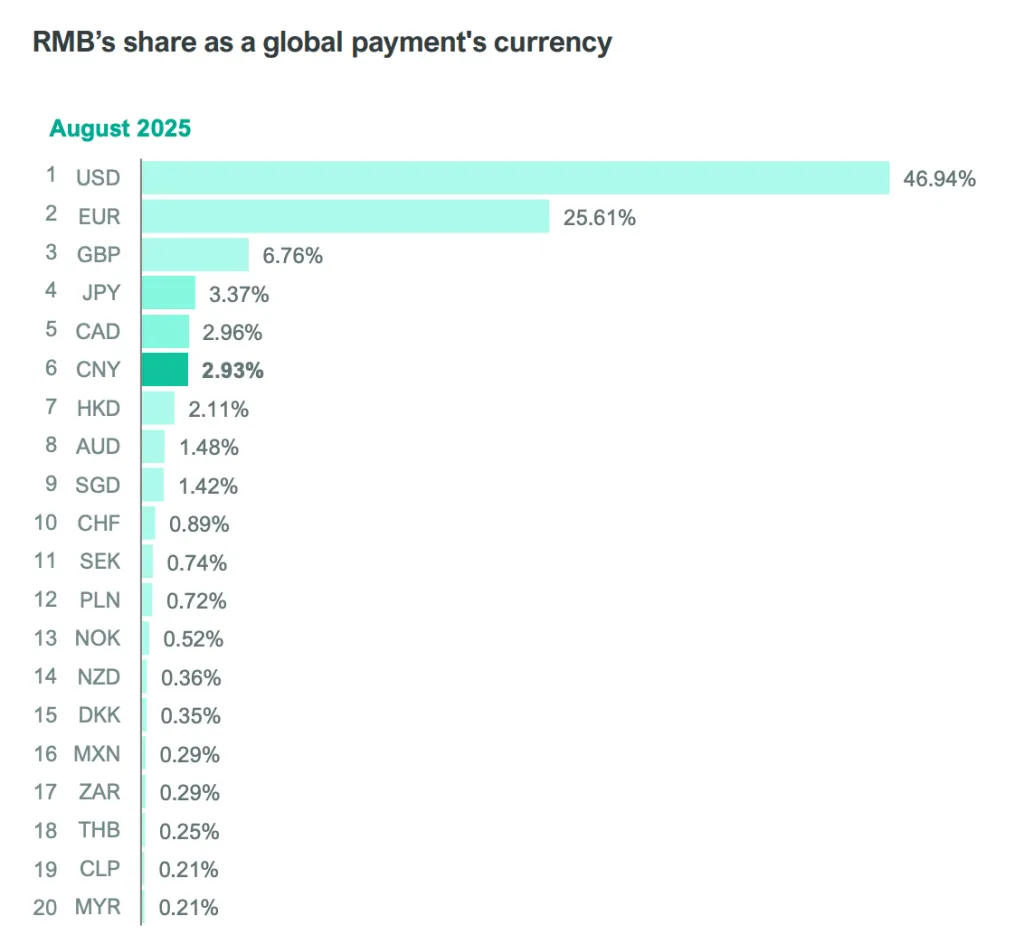 Одной из целей Пекина также было противостояние доминированию американского доллара. По данным RMB Tracker от SWIFT, по состоянию на август юань был шестой наиболее активной валютой в мировых платежах с долей 2,9%. Показатель нацвалюты США составил почти 47%.