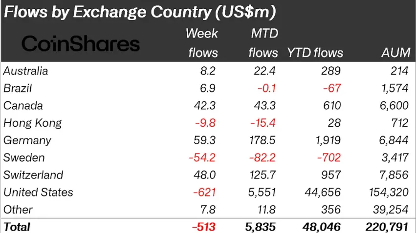 Большая часть оттока капитала пришлась на США — инвесторы вывели $621 млн. Между тем участники рынка из Германии, Швейцарии и Канады восприняли снижение цен как возможность для покупки. Приток средств в этих странах составил $54,2 млн, $48 млн и $42,4 млн соответственно.