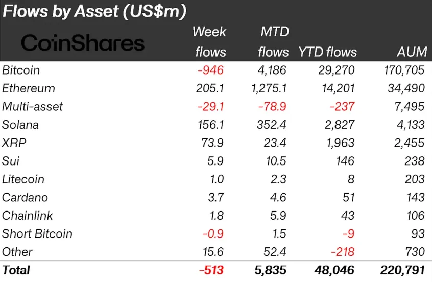 На фоне падения котировок инвесторы нарастили вложения в альткоины. Приток средств в продукты на базе Ethereum составил $205 млн.