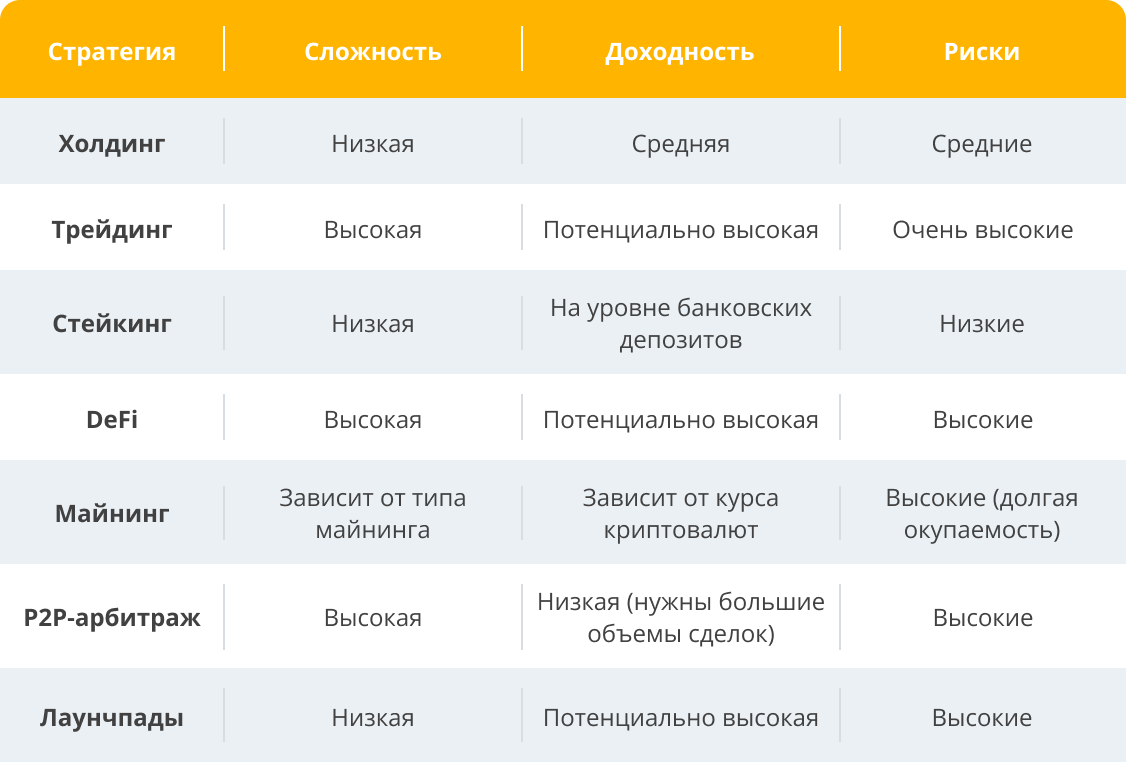 Новичкам стоит начинать с консервативных подходов — долгосрочного инвестирования в крупные криптовалюты (ходлинга) и стейкинга. По мере накопления опыта можно переходить к более сложным стратегиям: трейдингу и DeFi.