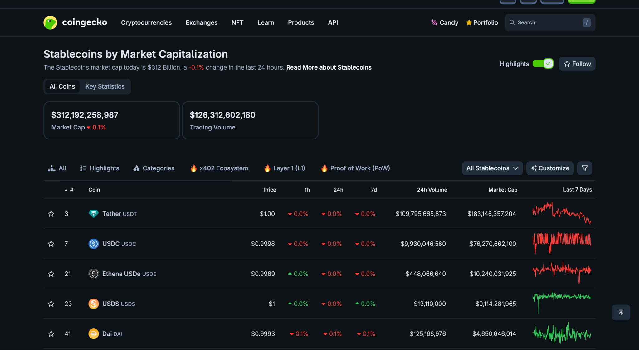 Глобальный сектор «стабильных монет» продолжает активно развиваться. На момент написания капитализация сегмента составляет $312,2 млрд.