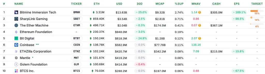 Крупнейшим держателем остается Bitmine. На прошлой неделе компания докупила 77 055 ETH на сумму около $319 млн, увеличив общие резервы до до 3,3 млн ETH, или $13,7 млрд.